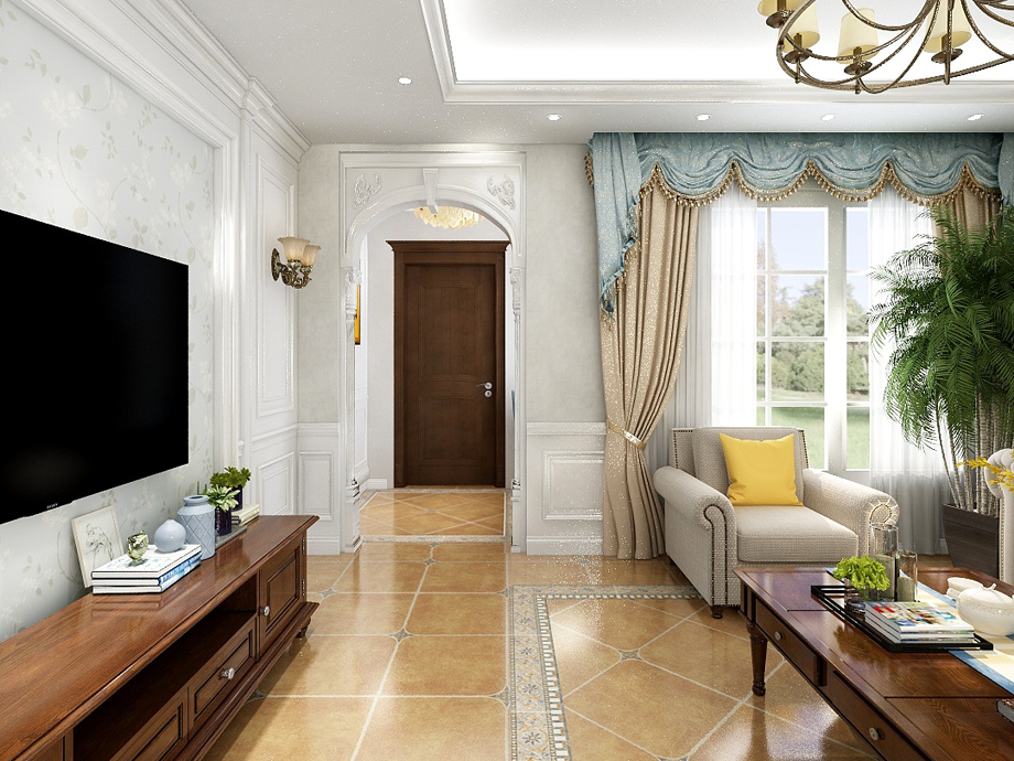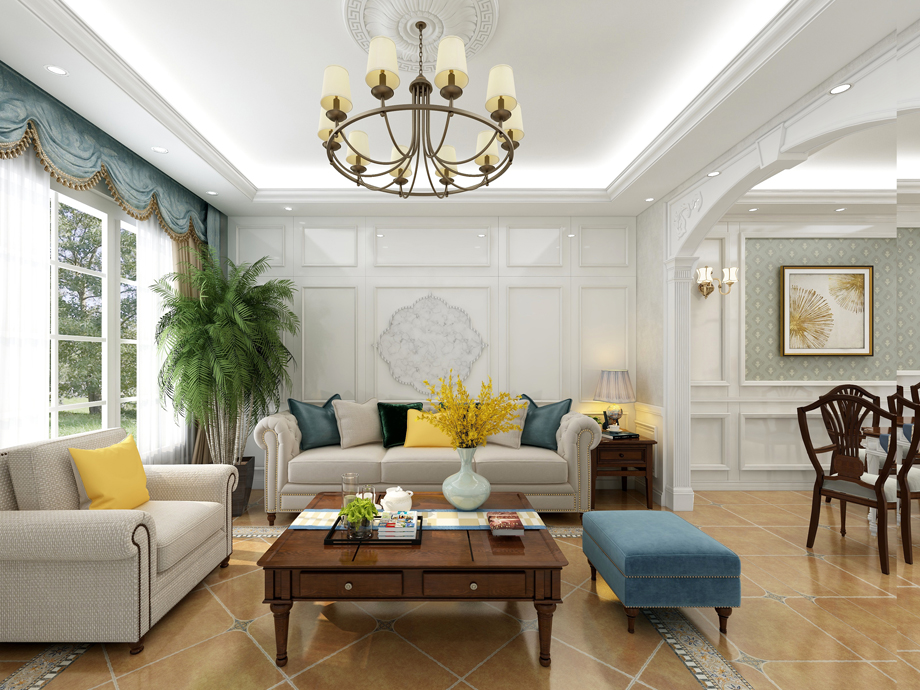 1、客廳:美式客廳風格較多采用嵌入式石膏吊頂,搭配精致的水晶吊頂,營造出一種懷舊、浪漫的感覺。以大理石作為地面裝飾材料,光澤感佳,在沙發(fā)區(qū)鋪上大幅花紋地毯,使空間區(qū)域劃分更加清晰。復古造型的組合沙發(fā),以及茶幾都具有上乘的質感,讓美式古典風格得以進一步的彰顯。