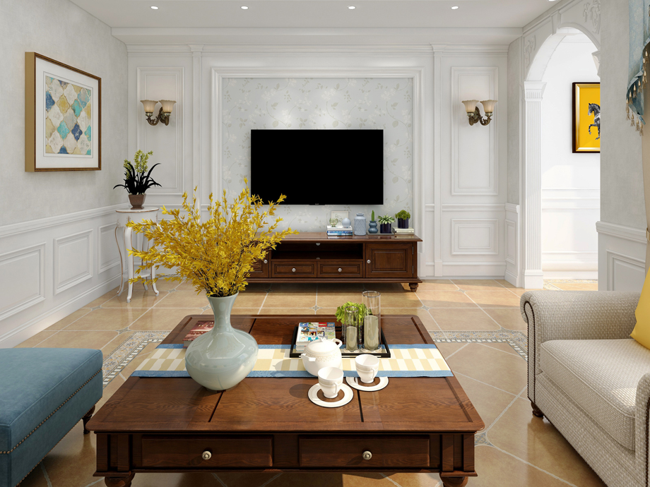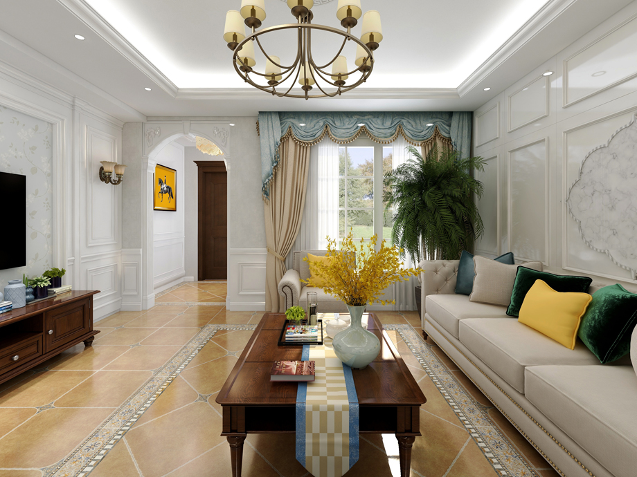 客廳作為待客區(qū)域,一般要求簡潔明快,同時裝修較其它空間要更明快光鮮,通常使用大量的石材和木飾面裝飾;美國人喜歡有歷史感的東西,這不僅反映在軟裝擺件上對仿古藝術品的喜愛,同時也反映在裝修上對各種仿古墻地磚、石材的偏愛和對各種仿舊工藝的追求上??傮w而言,美式田園風格的客廳是寬敞而富有歷史氣息的。