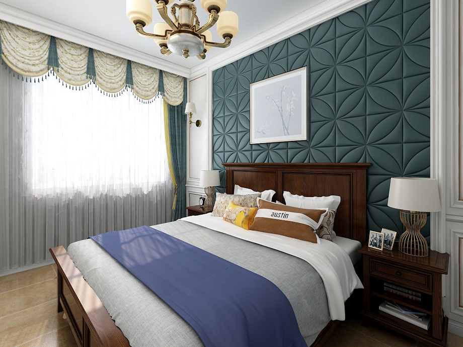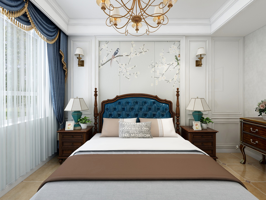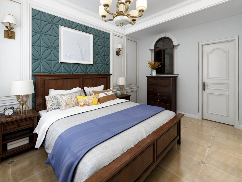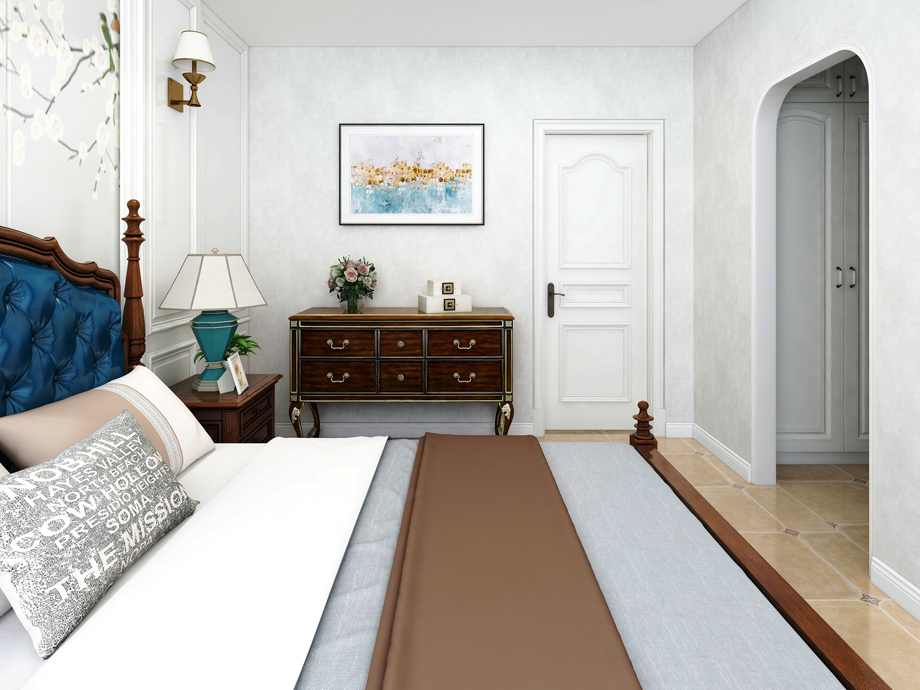 美式家居的臥室布置較為溫馨,作為主人的私密空間,主要以功能性和實用舒適為考慮的重點,一般的臥室不設頂燈,多用溫馨柔軟的成套布藝來裝點,同時在軟裝和用色上統(tǒng)一。